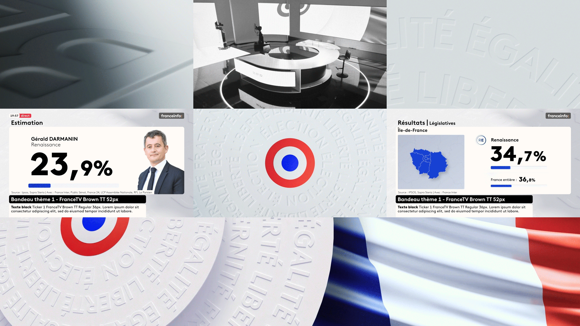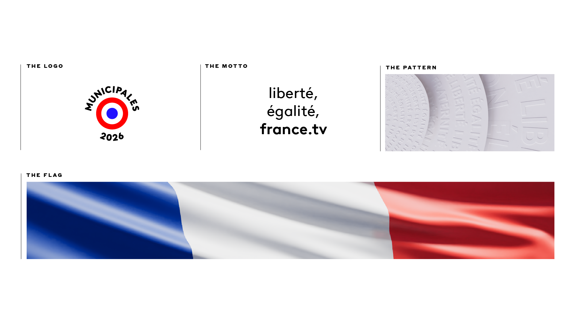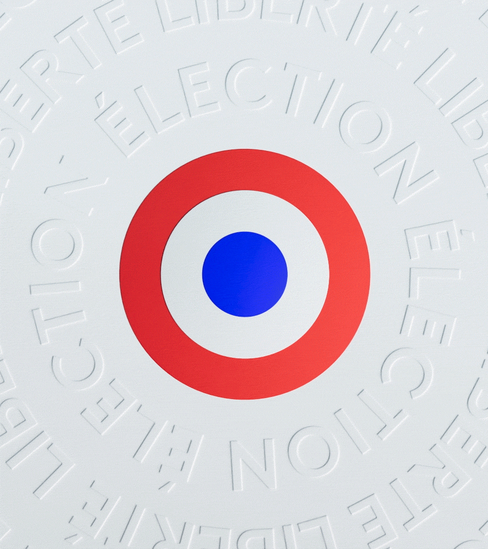 The visual concept centers on the national cockade, reimagined through circular typography. The motto « Liberté, Égalité, Fraternité » radiates in concentric circles, creating a dynamic and inclusive momentum. The embossed effect, reminiscent of high-end paper grain, adds a tactile and organic dimension to the broadcast design. It is a celebration of democracy, bridging historical heritage and modern graphic signatures.