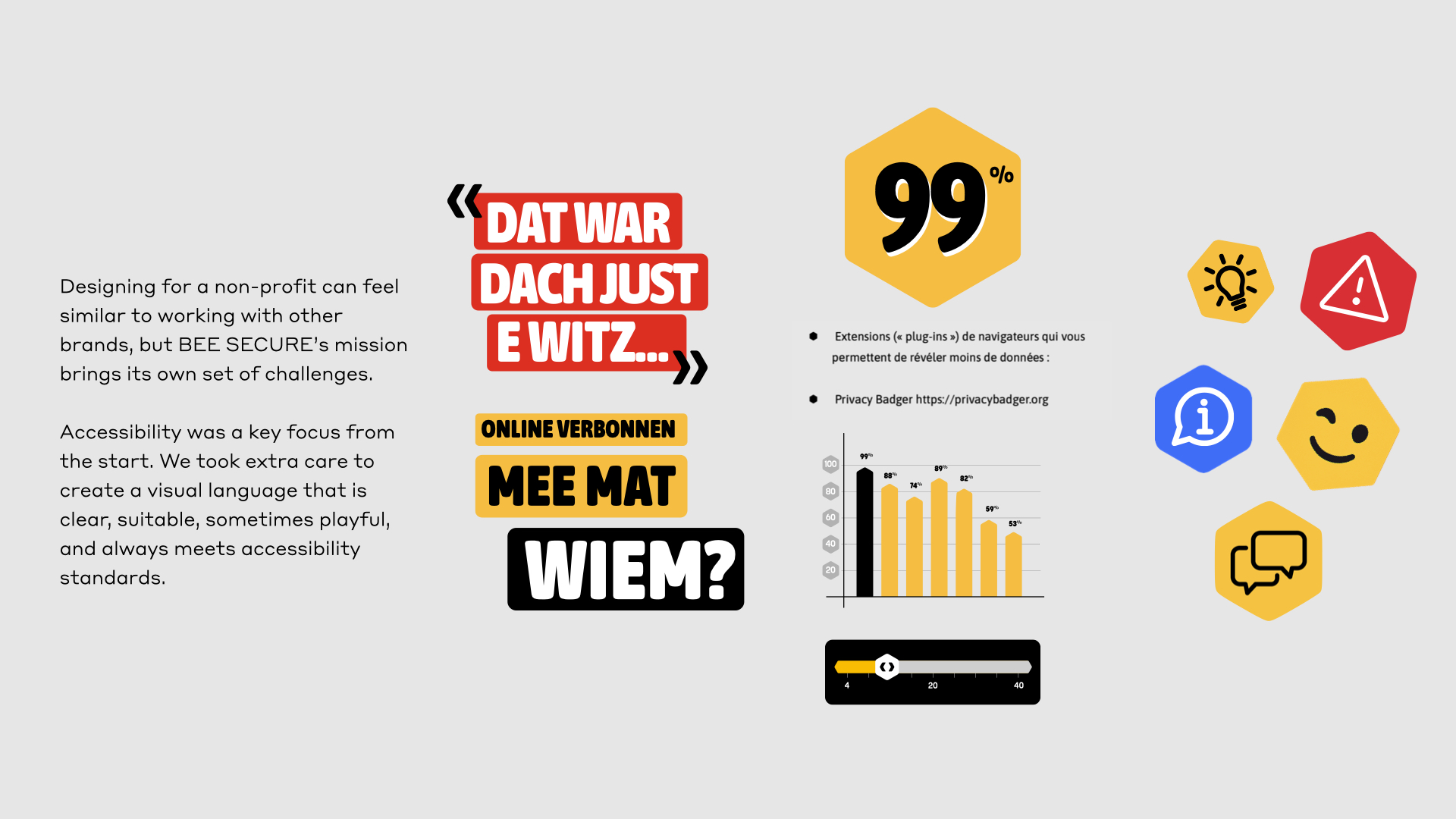 Gédéon created a visual system that is flexible and expressive, with a strong focus on accessibility and clarity. The guidelines help the BEE SECURE team make content that is easy to understand, creative, and suited to different audiences.